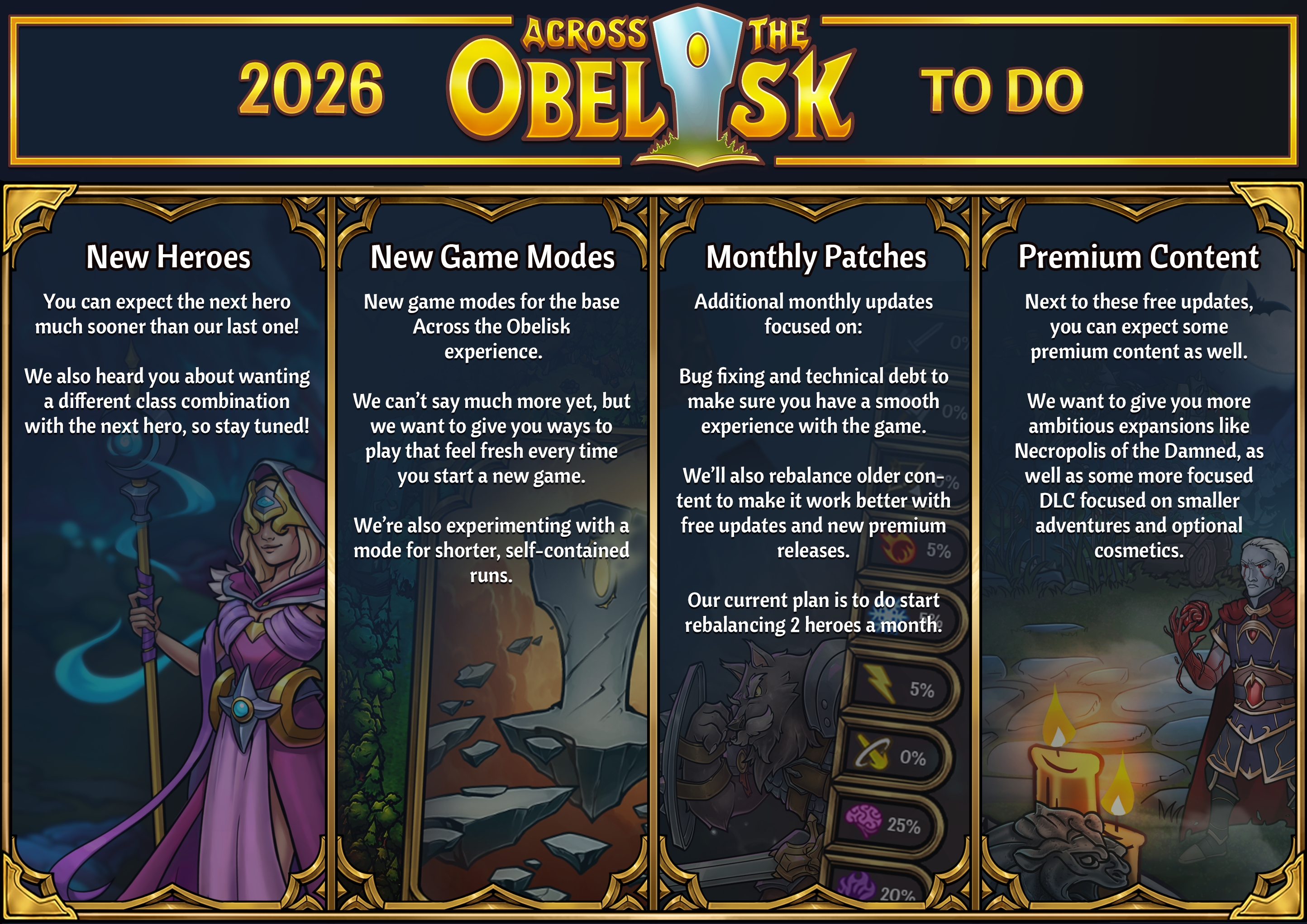 One of our goals moving forward is to bring more free updates to the game! We want to give you more game modes, heroes, content and adventures that you and your friends can enjoy with the base game of Across the Obelisk. Those will include: