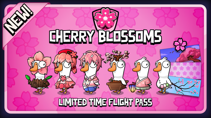 The Cherry Blossoms Flight Pass has arrived! Play matches and complete tasks to earn Flight Points and unlock a delicate collection of spring-themed cosmetics. Dress up your Goose in soft petals, elegant pinks, and festival-ready styles inspired by the fleeting beauty of the Cherry Blossom season.