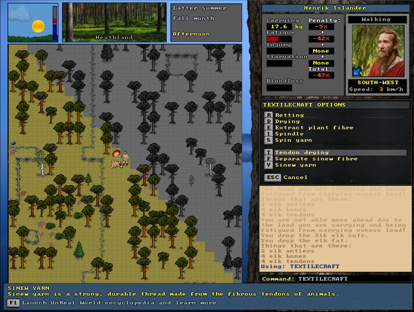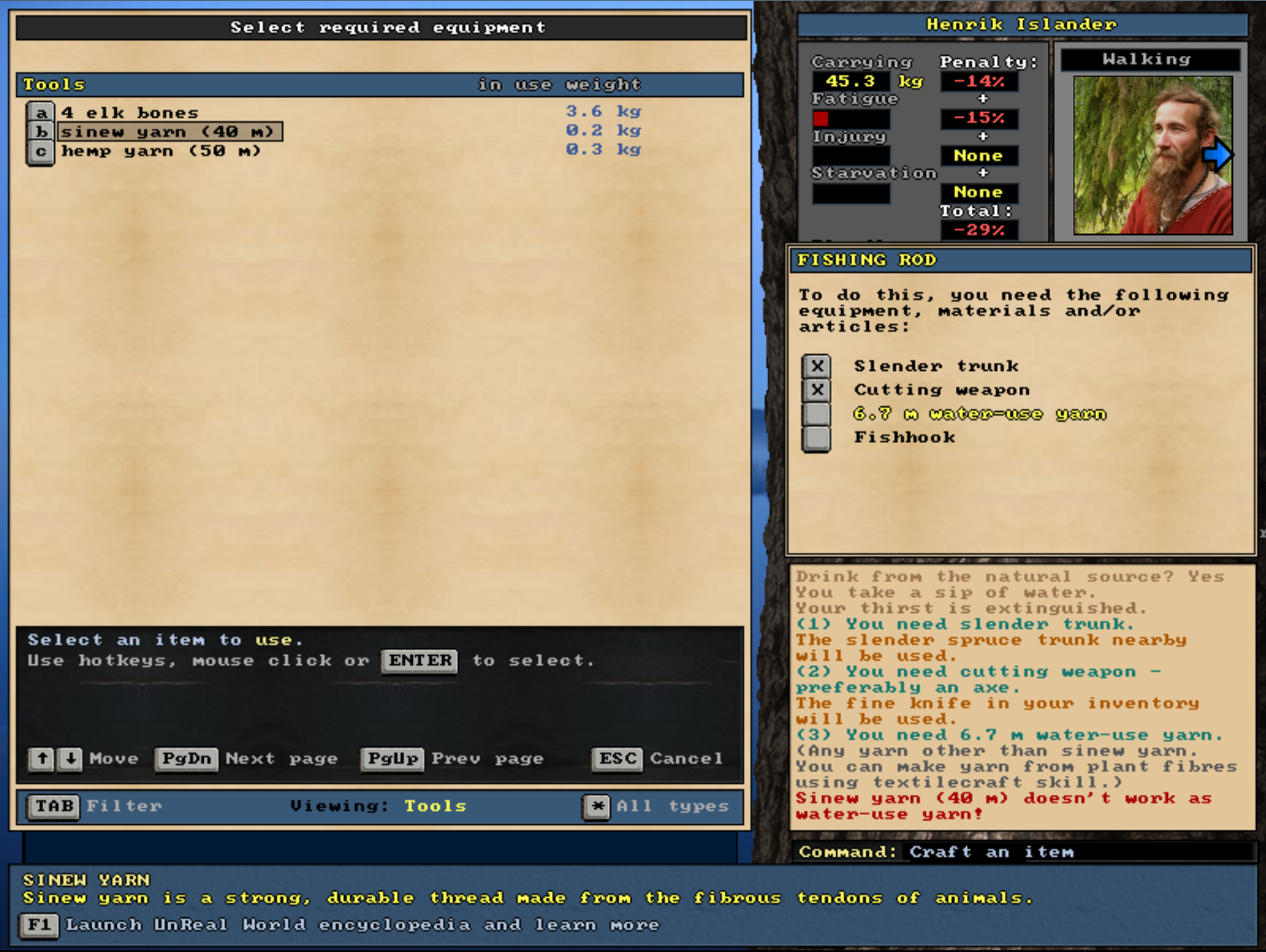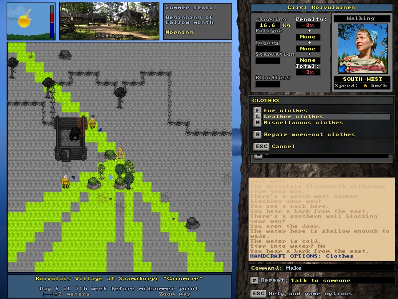 Olesa is about to start making himself a pair of leather boots. It will take a few days, but he can—and should—pause in between to eat and rest. And if he succeeds in crafting fine boots, it might be worthwhile to try using them for trading with the villagers.