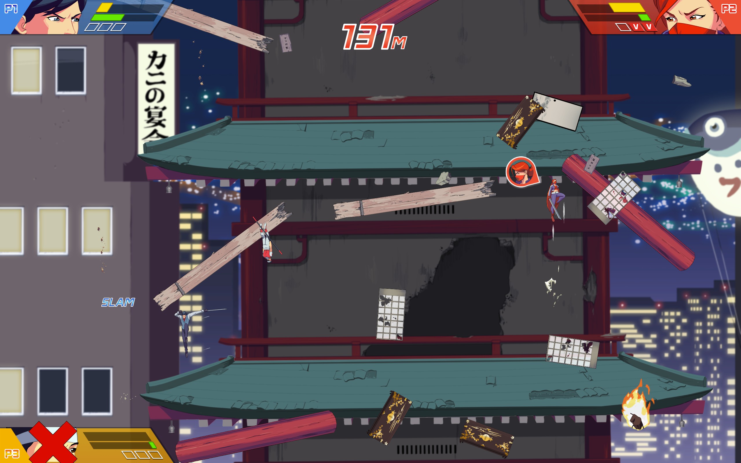 CO-OP ARCADE FIGHTER-CLIMBER. Run, jump, and fight your way to the top of a collapsing building. Compete with up to three of your friends in this 90s style competitive platform brawler.