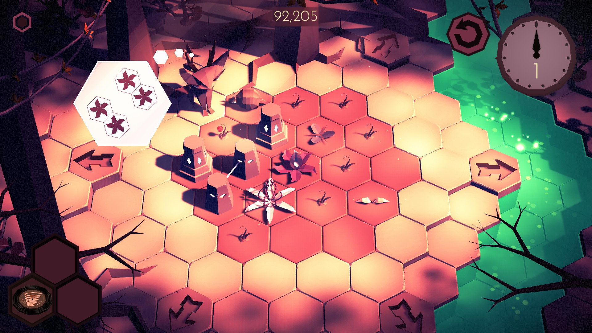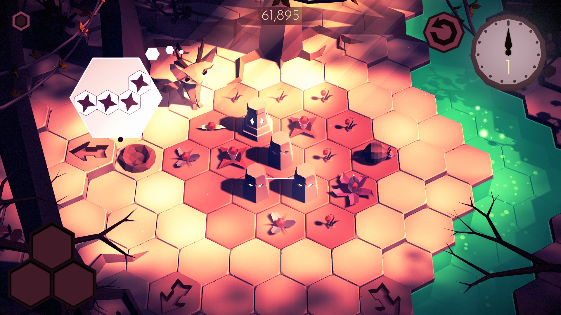 You have just arrived in a magical forest world with a hexagon board at its center, a mysterious creature nearby, and secrets lurking in the shadows. Why are you here, and what will you do next? A deceptively simple puzzle game, wrapped in a magical adventure.