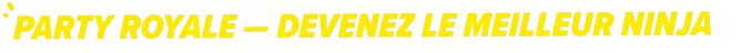 Parmi 12 participants qui se livrent une lutte sans merci, bataillez ferme pour affirmer votre suprématie et devenir le seul warrior encore en lice ! Vous décrocherez ainsi le titre de meilleur ninja. Réussissez un à un les défis des différents modes... et tant que vous y êtes, essayez l'expérience de Ninja Party Royale ! Au fur et à mesure de chaque phase, les adversaires seront éliminés et au final, il ne restera plus qu'un seul winner !